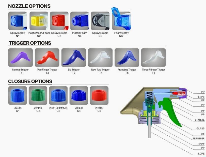 Этот высококачественный распылитель с курковым механизмом имеет различные варианты насадок. Продукт может распыляться в виде пены, распыления или струи.